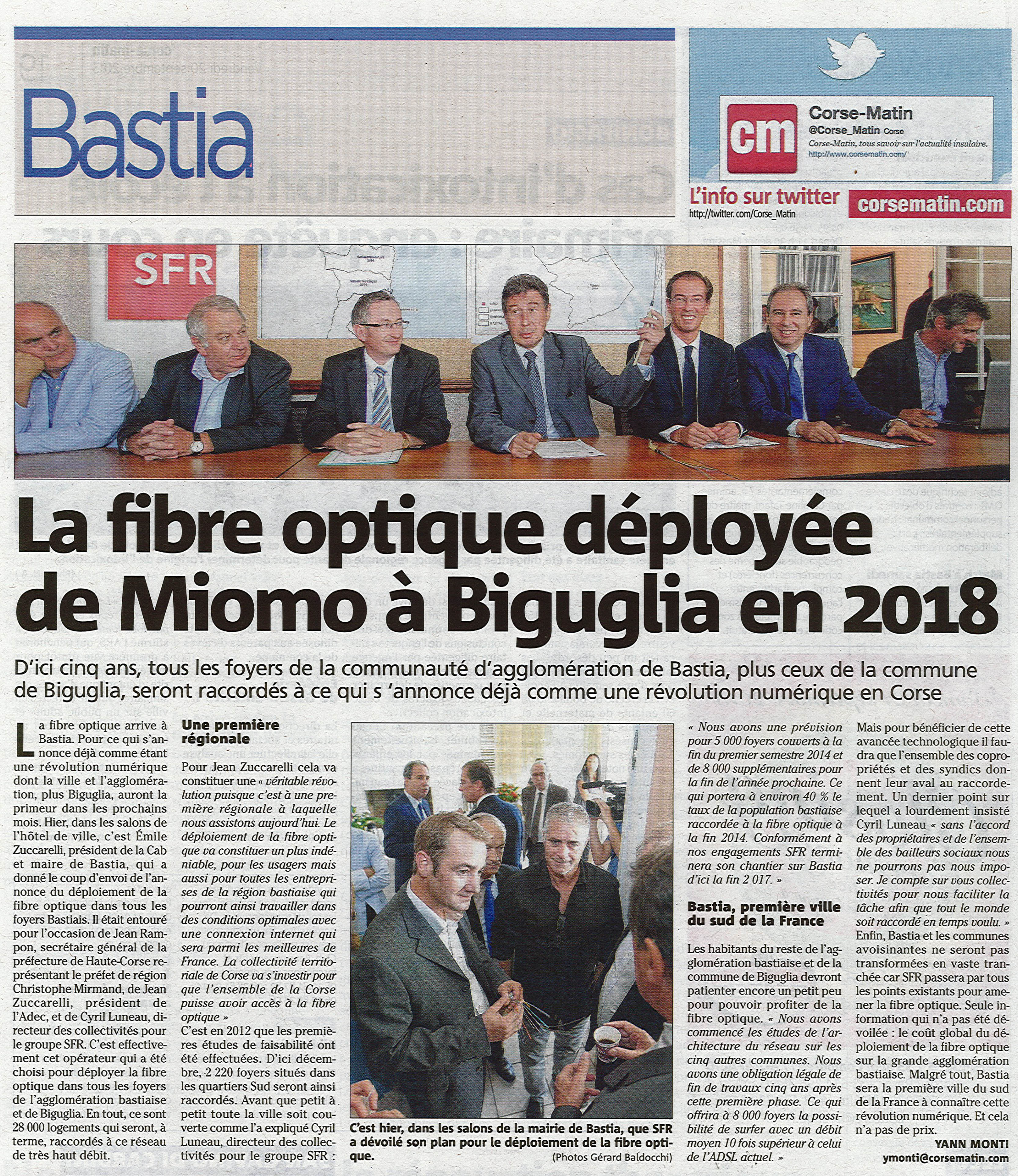 « Aujourd’hui, l’opérateur SFR, nous rassure en nous annonçant, d’ici fin 2013 –l’échéance est proche– le raccordement de 2 200 foyers sur Bastia. C’est un premier déploiement que nous attendons tous depuis quelques mois, il est le fruit d’une collaboration réussie entre l’opérateur et les collectivités notamment la Mairie de Bastia et la Communauté d’agglomération. Par son engagement à Bastia, SFR fait la démonstration que l’ingénierie autour des technologies très haut débit et de la fibre optique est mobilisable en Corse aux côtés d’entreprises insulaires qui ont su se doter d’un vrai savoir-faire dans ce domaine ».