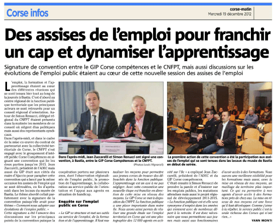 Cette convention s’inscrit dans le cadre d’un protocole de coopération scellé en octobre 2012 par la Collectivité Territoriale de Corse et les instances du Centre National de la Fonction Publique Territoriale.