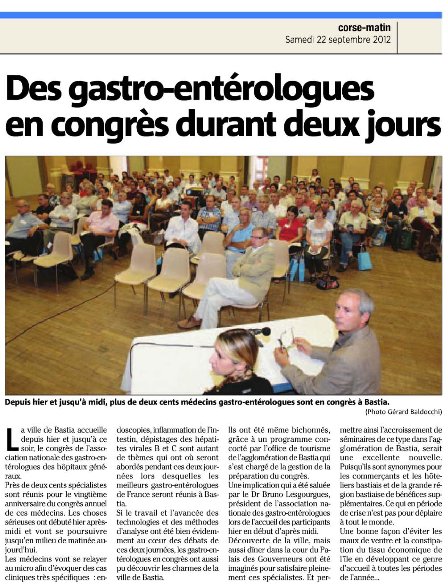 Article « Des gastro-entérologues en congrès durant deux jours » - Corse-Matin 23 septembre 2012