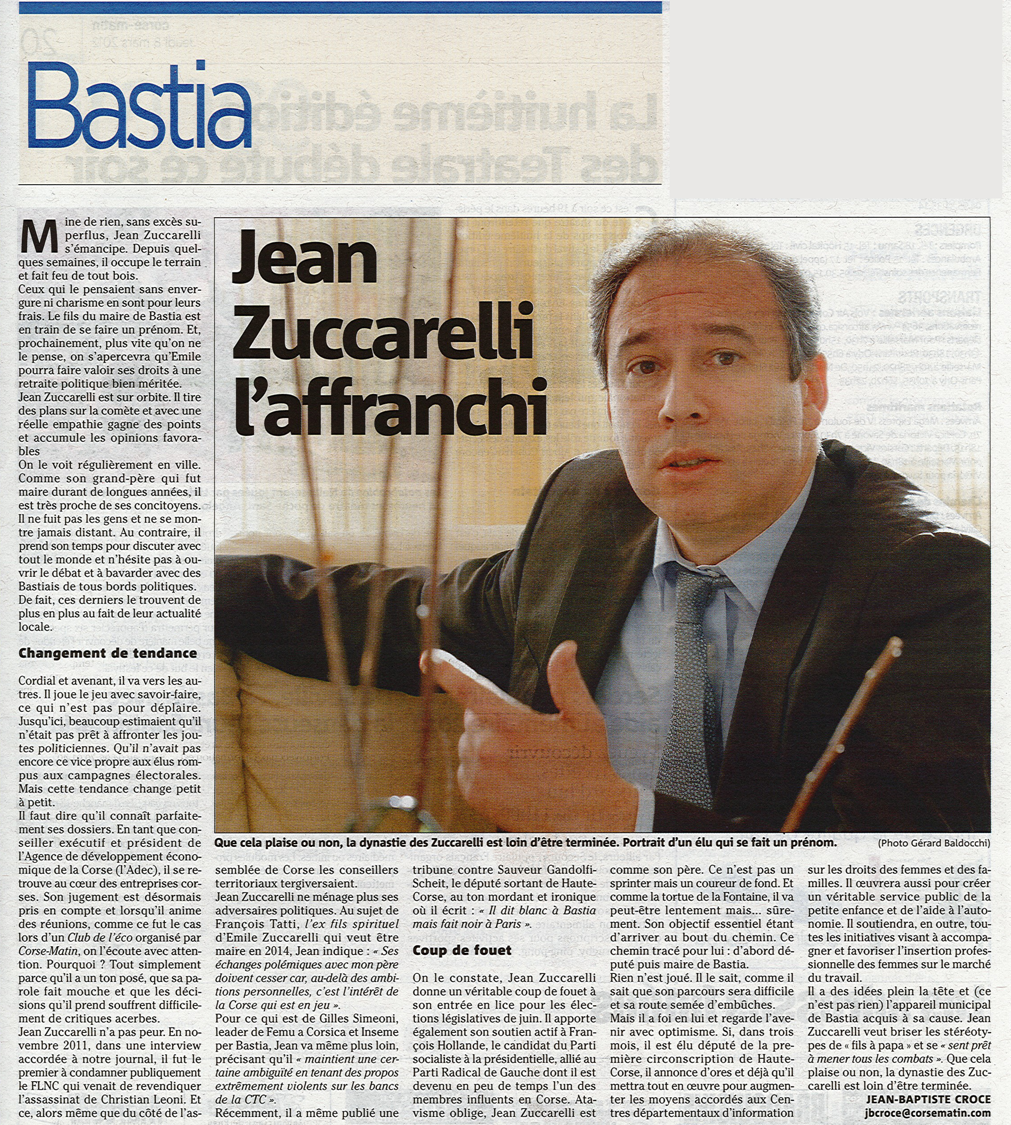 Article "Jean Zuccarelli l'affranchi" - Corse-Matin 8 mars 2012