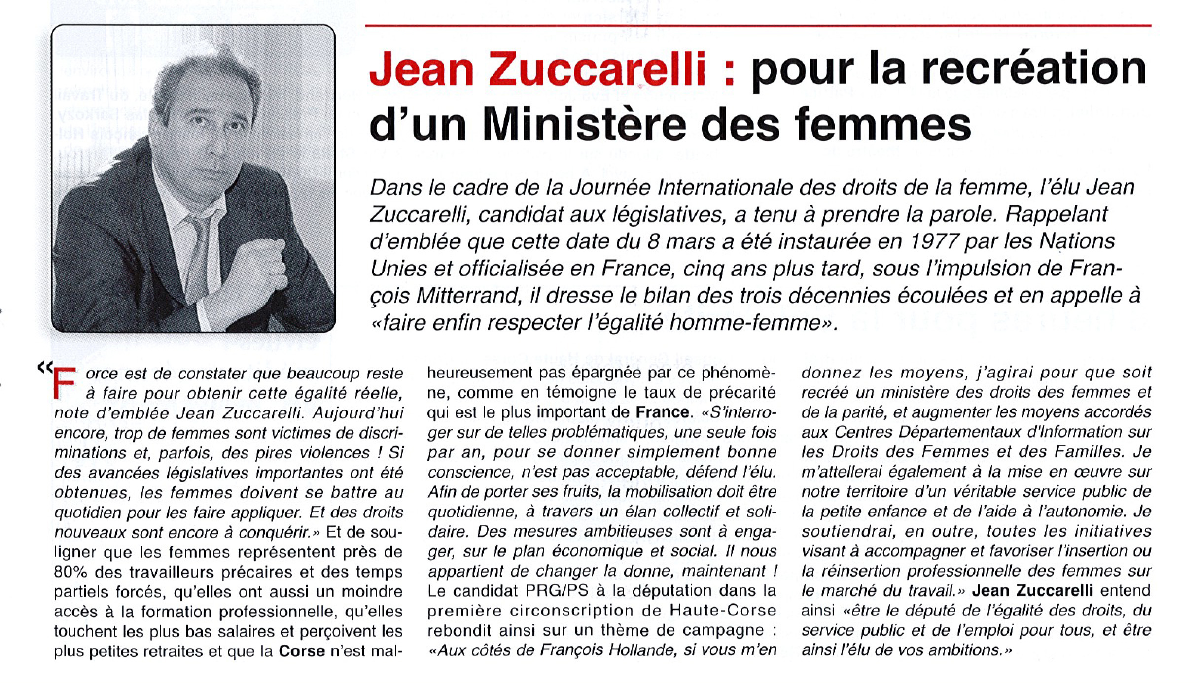 Article « Jean Zuccarelli : pour la recréation d’un Ministère des femmes » - L’Informateur Corse Nouvelle du 9 au 15/03/2012