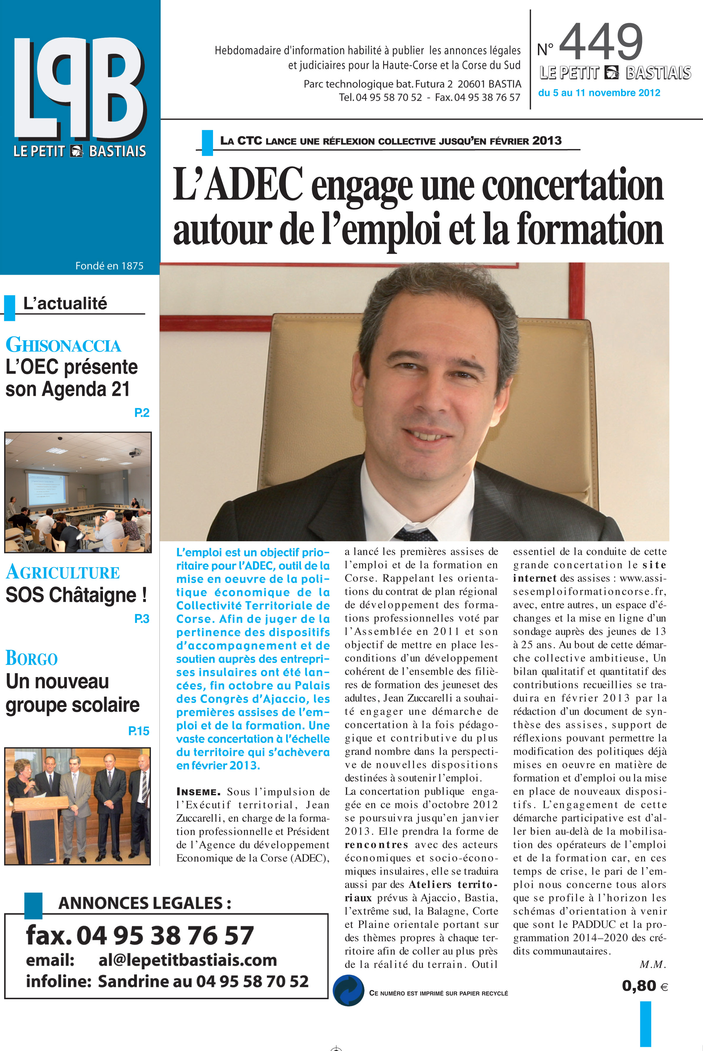 Dans son édition du 5 au 11 novembre 2012, le journal « Le Petit Bastiais » revient sur le lancement des 1ères Assises de l’emploi et de la formation en Corse, sous l’impulsion du conseiller exécutif Jean Zuccarelli.