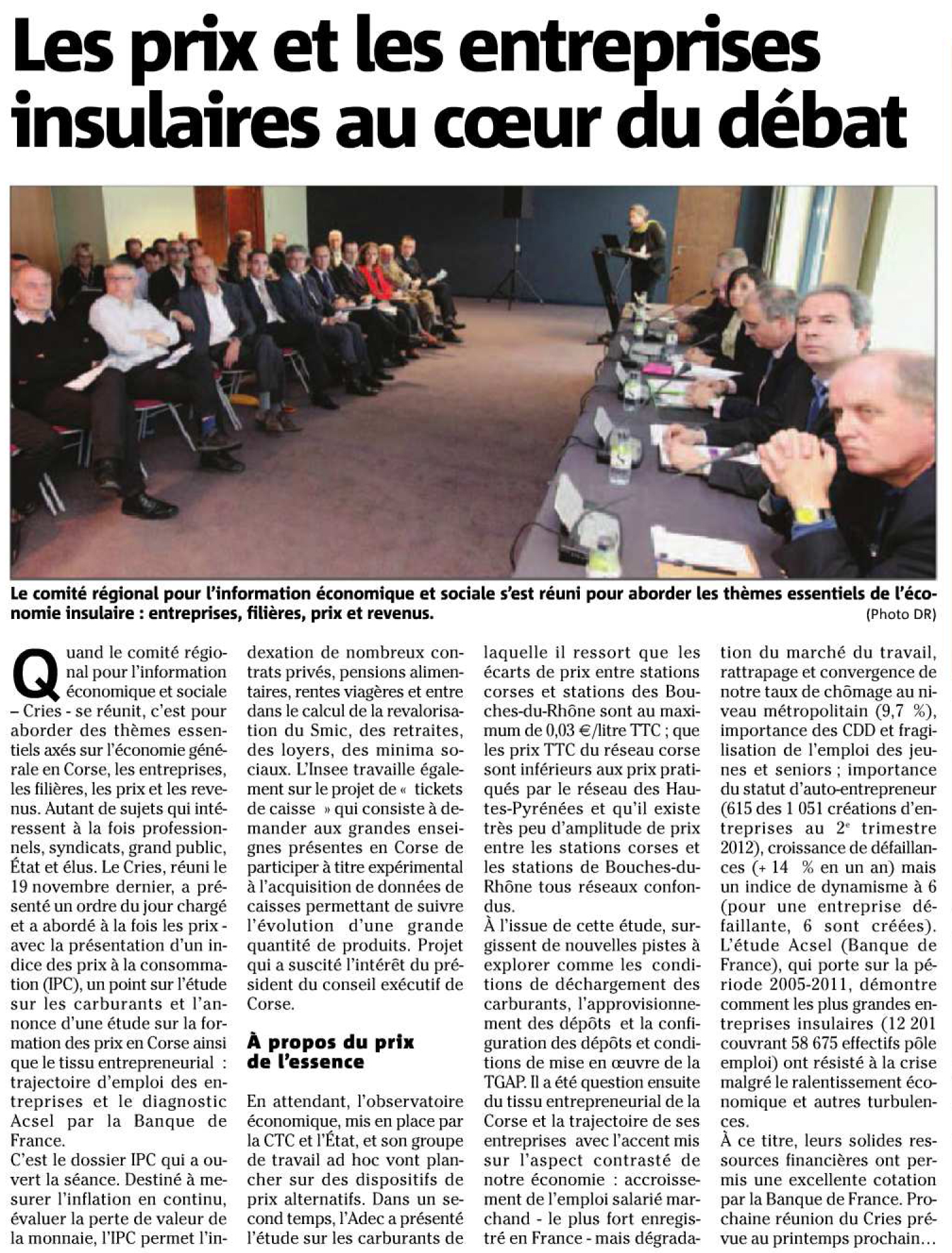 Article « Les prix et les entreprises insulaires au cœur du débat » - Corse-Matin 24 novembre 2012