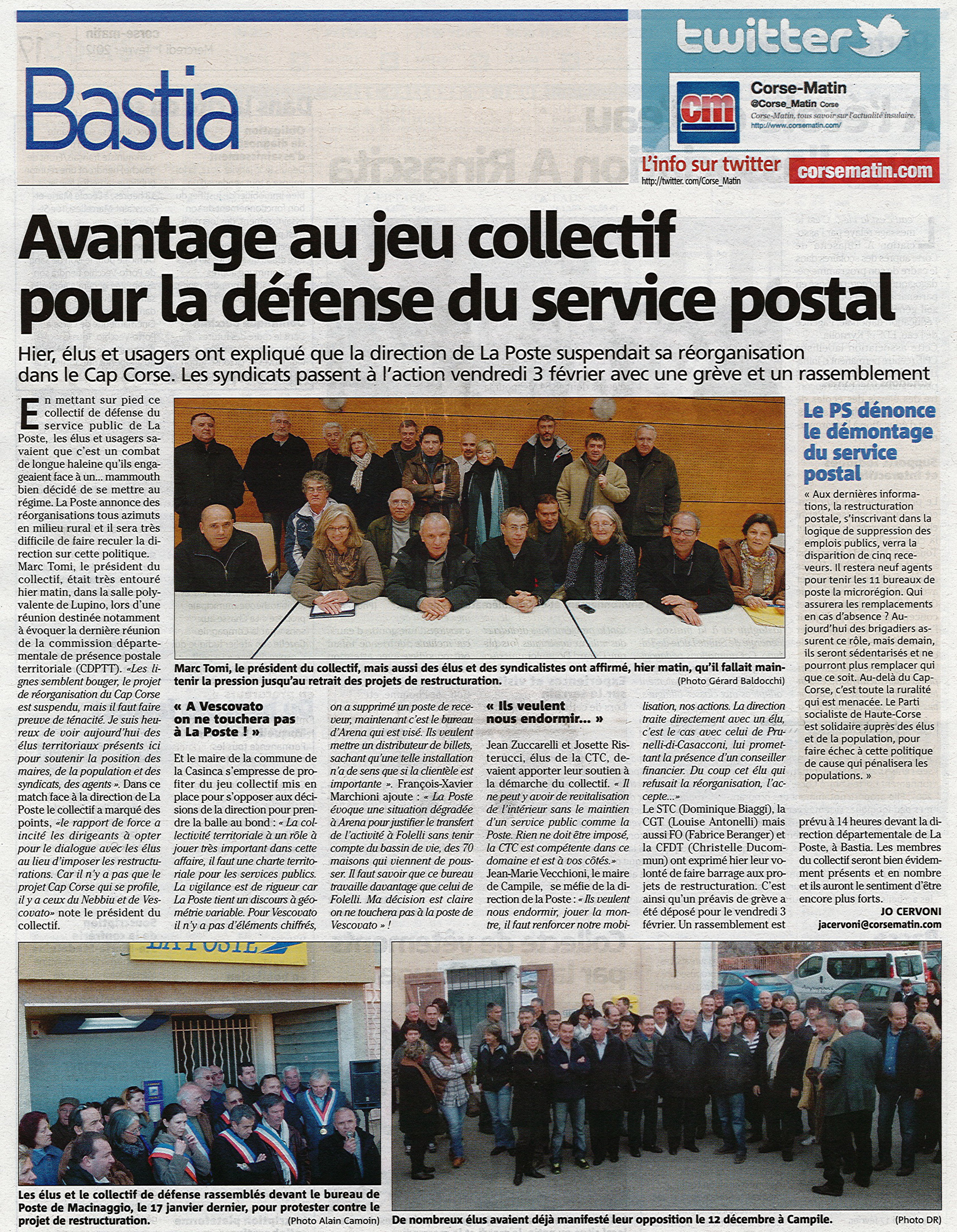 À noter qu’un rassemblement est prévu vendredi 3 février à 14 heures, devant la direction départementale de La Poste, à Bastia. Mobilisation à laquelle participera naturellement Jean Zuccarelli, aux côtés de l’ensemble des personnes qui souscrivent à la démarche…