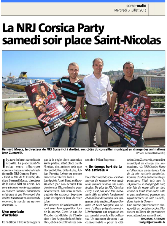 Mardi 2 juillet, Jean Zuccarelli, conseiller municipal de Bastia délégué au commerce, à l’artisanat ainsi qu’aux animations commerciales et festives, a participé, aux côtés de Bernard Mosca, directeur d’NRJ Corse, à la conférence de presse de présentation de la NRJ Corsica Party 2013, rendez-vous incontournable, programmé samedi soir place Saint-Nicolas, avec, à l’affiche, une pléiade d’artistes qui culminent au sommet des hit-parades. Organisé par NRJ Corse en étroit partenariat avec la Municipalité, ce concert géant (entièrement gratuit) offre chaque année de belles réjouissances aux milliers de spectateurs présents.