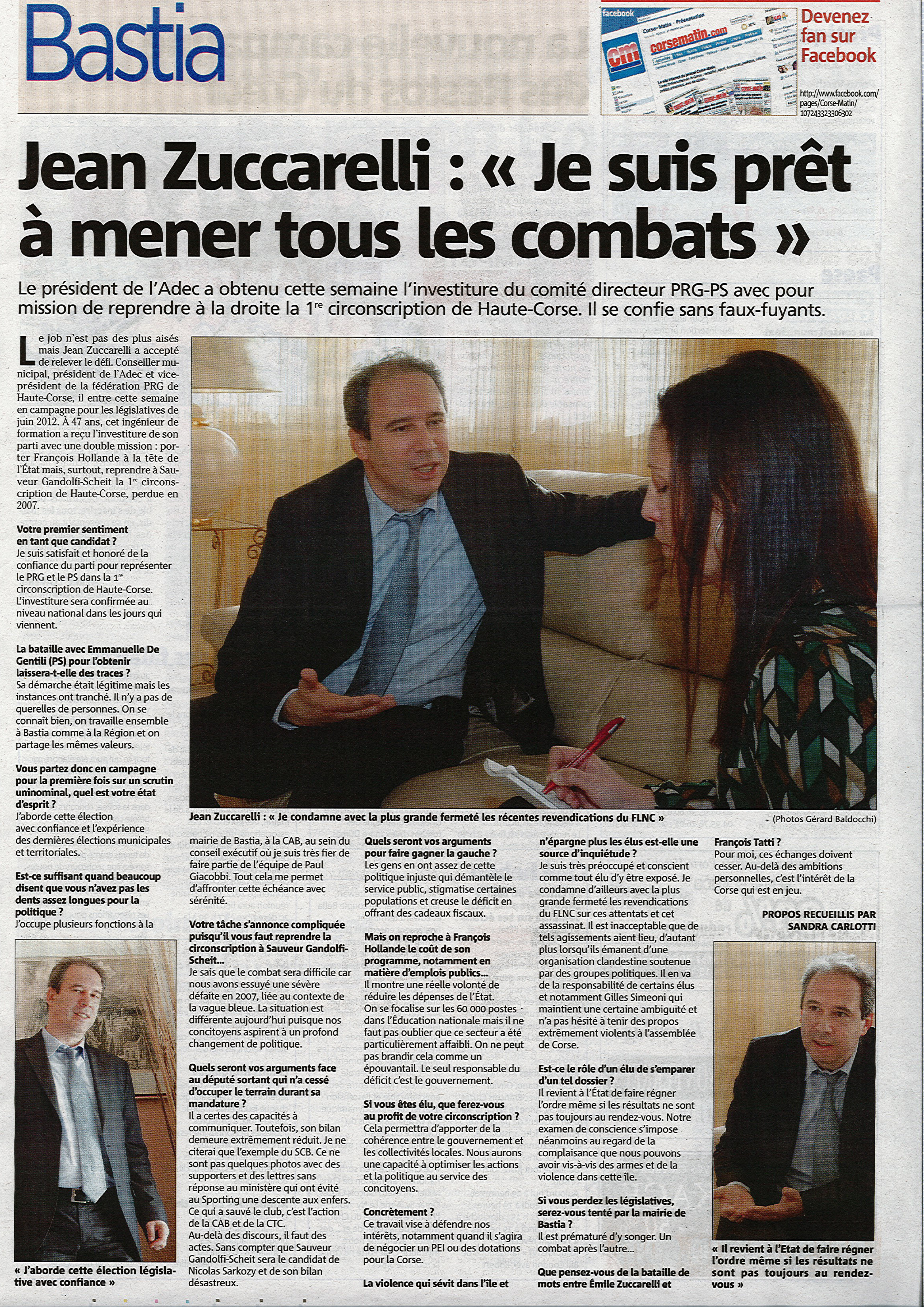 "Le job n'est pas des plus aisés mais Jean Zuccarelli a accepté de relever le défi. Conseiller municipal, président de l'Adec et vice-président de la fédération PRG de Haute-Corse, il entre cette semaine en campagne pour les législatives de juin 2012. À 47 ans, cet ingénieur de formation a reçu l'investiture de son parti avec une double mission : porter François Hollande à la tête de l'État mais, surtout, reprendre à Sauveur Gandolfi-Scheit la 1ère circonscription de Haute-Corse, perdue en 2007".