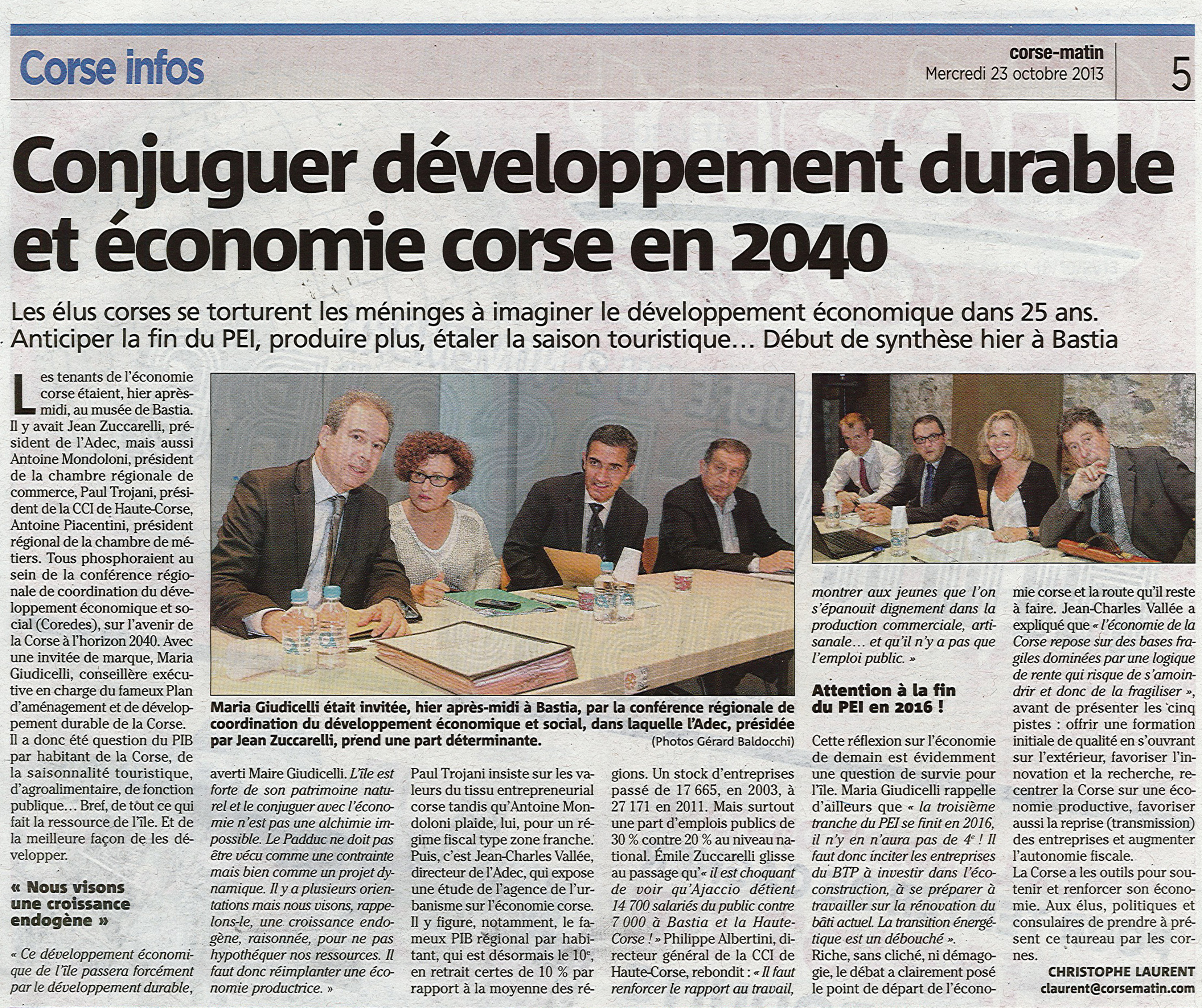 "En portant la contribution de l’ADEC au PADDUC, en juillet 2012, j’ai fixé l’horizon de nos actions en revendiquant la recherche de nouvelles solidarités pour une compétitivité renforcée", a notamment indiqué Jean Zuccarelli, le président de l'ADEC. "Ces deux termes a priori antagonistes, doivent non seulement se conjuguer dans un modèle de développement acceptable, mais encore constituer avec l’éco-compatibilité, le germe de nouveaux modes de production et de consommation, créateurs de richesses, qui seuls permettent l’exercice d’une solidarité active, fondée sur la formation, l’accès à l’emploi, aux services publics et à l’égalité numérique ou encore à l'épanouissement culturel".