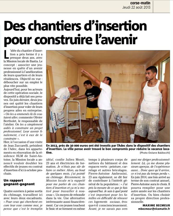 Initiée en décembre 2011, sous l’impulsion de la Mission Locale de Bastia, cette structure d’Insertion par l’Activité Economique (IAE) est proposé aux jeunes sans qualification ni expérience professionnelle significative.